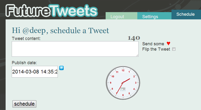 FutureTweets is also a nice tool that is used for scheduling Twitter tweets. This free tool allows you to send Twitter tweets at a specific time such as daily, weekly, monthly or yearly. Just after login, you need to select your current time-zone. After selecting time zone, make a click on schedule link which is located at the top right side of the page. Now write your Tweet, select the date and time to schedule. Once you are done, click on schedule button.